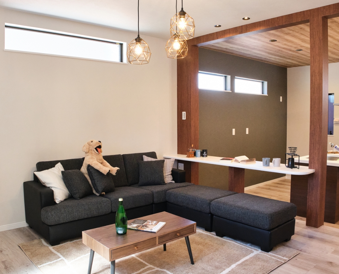 さらに土地が狭小なので、限られた空間でいかに快適に暮らせるかを考えました。土地の段差をむしろ上手く活かし、ステップリビングにしてリビング部分の床を少し高くすることで、視覚的に心の落ち着く、団らん空間に仕上げました。