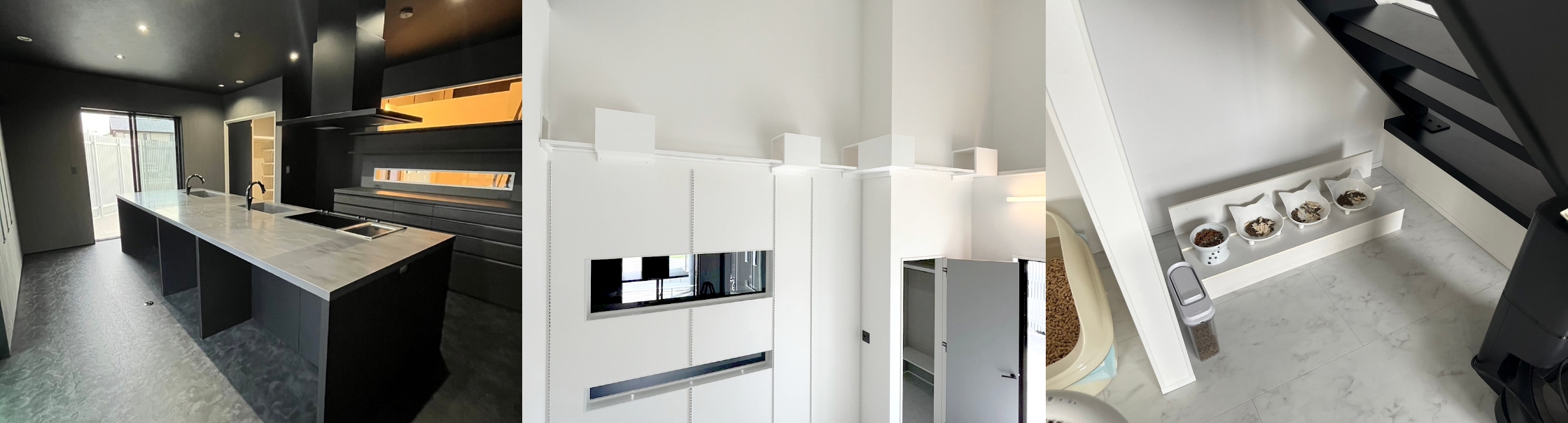 ワンちゃん1匹+猫ちゃん3匹が並んでご飯を食べられる専用カウンターも階段下に設計しました。