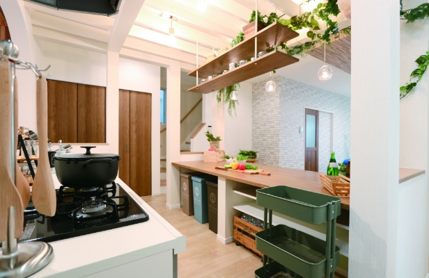 さらに隣接するキッチンとの間に同じく段差を活かしたカウンターを設置。お料理の提供が楽になるだけでなく、朝食を食べたり、読書をしたり、お子様の勉強スペースになったりとフレキシブルに活用できる空間に。